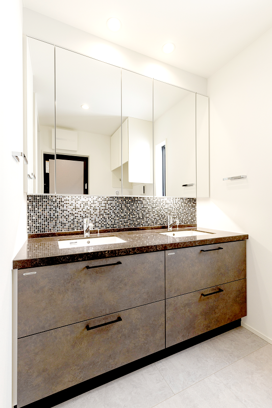 ホテルライクな格調へ、洗面化粧台はワイドカウンターにツインボウルの設え忙しい朝に、夫婦並んで利用できると好評です。日常をよりスマートに、爽やかな暮らしを演出するアイデアがいっぱい。