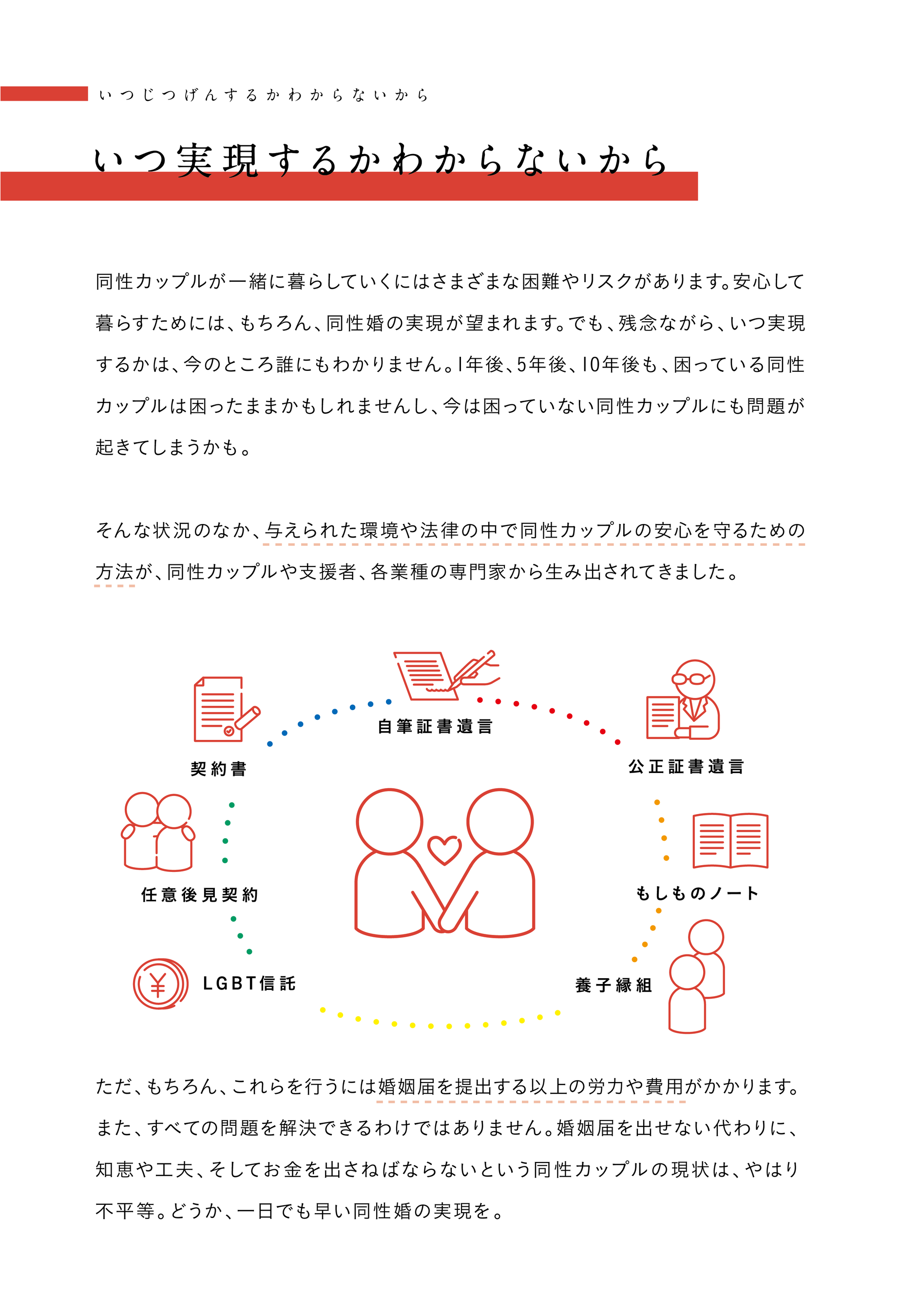 同性婚を願いつつも、同性婚がいつ実現するかは分かりません。結婚できずに困っている同性カップルに向けて、今の日本の状況(法律)でより安心して生きられる方法を紹介します。パートナーシップ制度や遺言・任意後見制度について詳しく解説し、ある同性カップルによる実物の公正証書遺言を展示します。