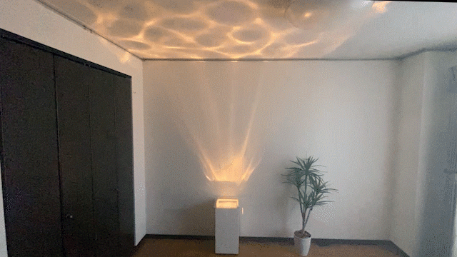 照明内部に設置された水槽を揺らしながら、「コースティクス」と呼ばれる水面での光の屈折による集光模様を壁や天井に投影します。