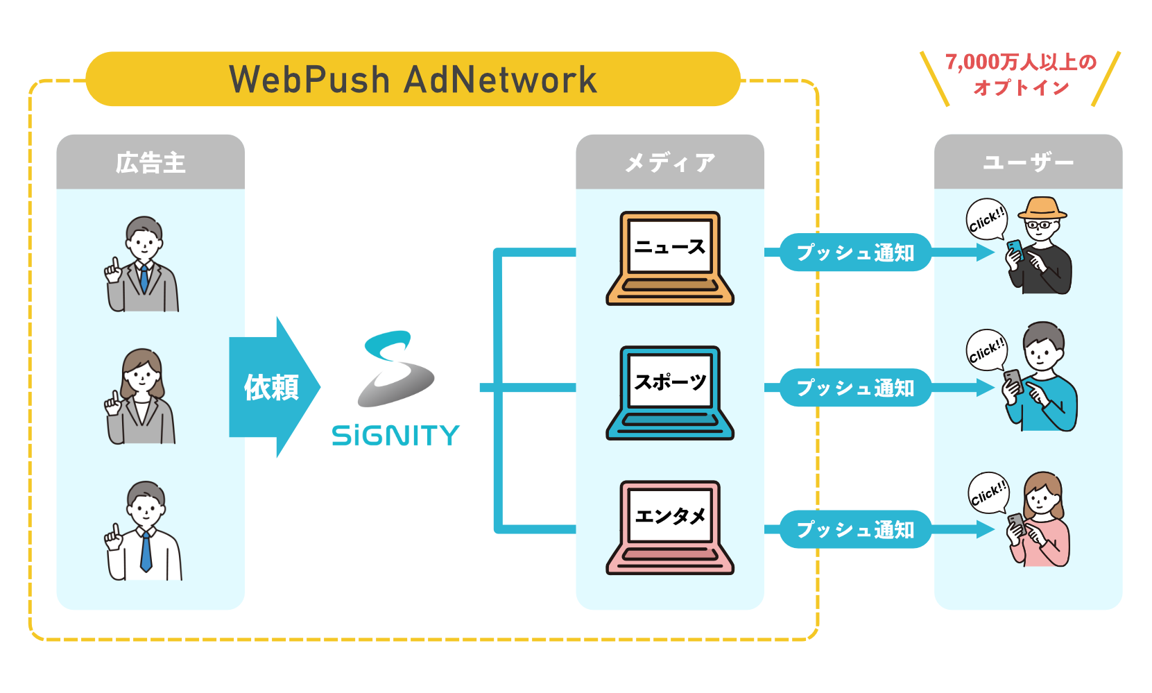 株式会社シグニティ(所在地:東京都江東区)は、特許技術に基づくWEBプッシュ通知サービス「PUSH ONE」を活用した新たなアドネットワークの手法「WebPush AdNetwork」を開始することをお知らせいたします。