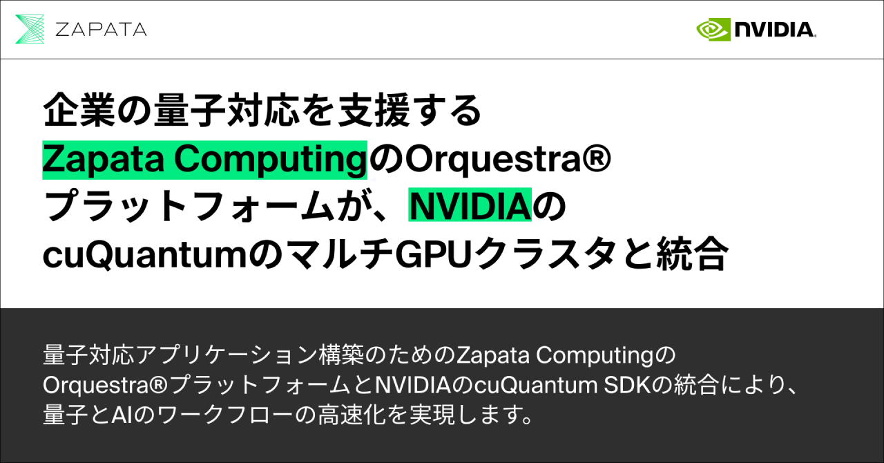 2022年7月13日、量子コンピュータ向けのソフトウェアを開発するZapata Computing, Inc. (本社:米国マサチューセッツ州ボストン、CEO:佐保井 久理須、以下:Zapata Computing)は、NVIDIA Corporation(本社:米国カリフォルニア州サンタクララ、CEO:Jensen Huang、以下:NVIDIA)と提携し、新しいマルチGPUクラスタ※1が統合されたことを発表します。
