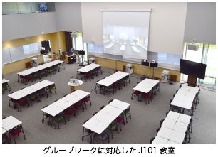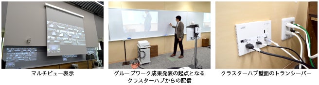 教室前面に設置された固定什器による従来型のAVシステムとは異なり、グループワークに対応したクラスターハブ(壁面の短焦点プロジェクター、カメラ、マイク、プレビューモニターで構成されている移動式ユニット)と全体講義用のシステムをIP-NINJARにより統合されたシステムとなっている。