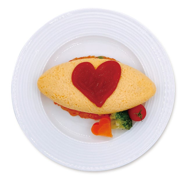 千穂の描き起こしミニキャライラストが持っているオムライスが食べられます。♡のケチャップがかわいい!