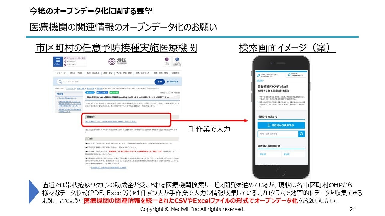 公開されているリストのデータ形式がPDFの場合があり、利用時は手入力。データ形式がExcelやCSV形式など機械判別可能なデータで公開、もっと言えば東京都のオープンデータのリストに掲載されていれば、素早くサービスリリースが可能になる。また、毎月など定期的にリストを更新してもらえると、負担が減っていち早く都民の皆様に貴重な情報を届けられる。