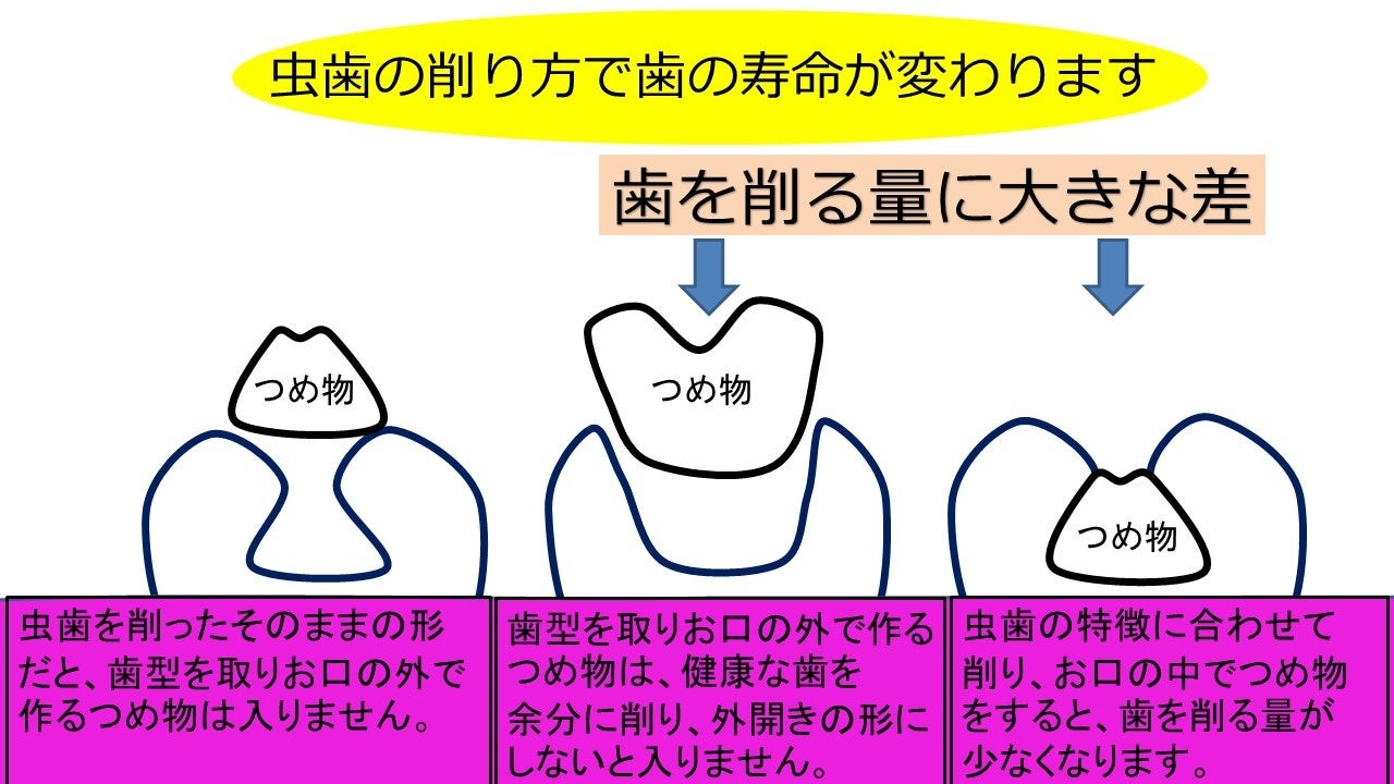 この治療法の最大の問題点は、健康な歯を余分に削ってしまうことです。つめ物が入るように外開きに歯を削るのですが、中で広がる虫歯の特徴と真逆の形になります。その分歯を多く削ってしまうため、歯はもろくなり割れやすくなります。