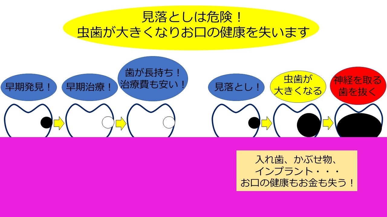 虫歯は見落とされると大きくなり、神経に感染してしまうと、痛みが出て神経を取らないといけなくなります。また、状態が非常に悪いと歯そのものを抜かないといけなくなります。