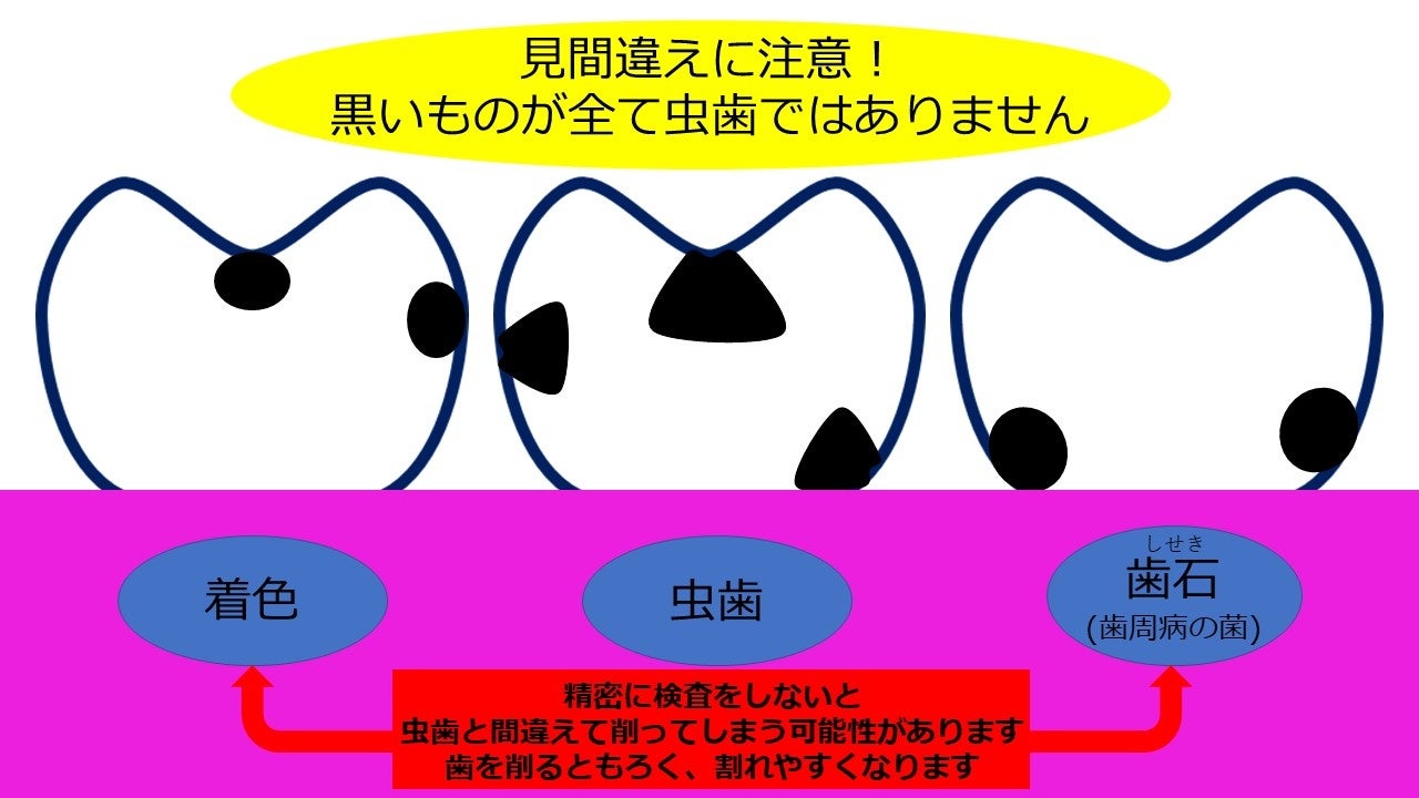 お口の中は暗く、歯は小さく見えにくいため、虫歯の見落としや見間違えがよく起こります。