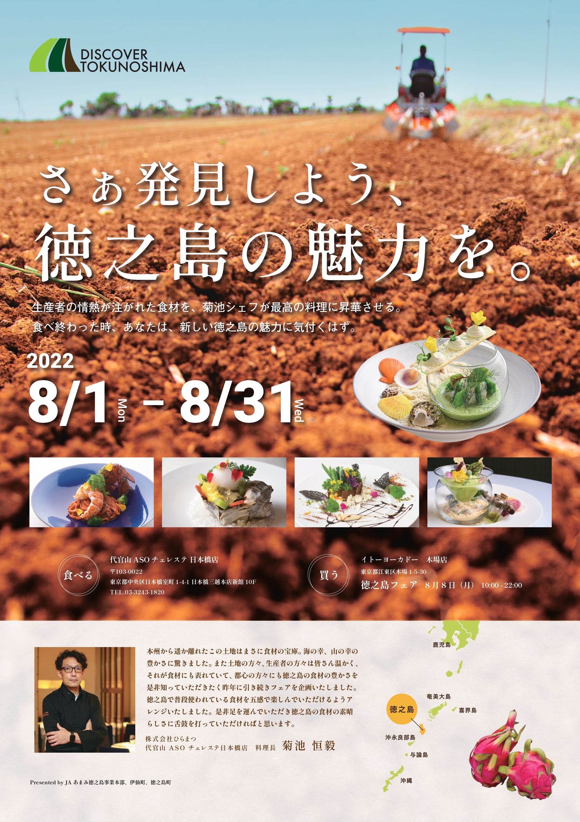 8月1日より、全メニューを徳之島食材で構成した徳之島フルコースが「代官山ASOチェレステ日本橋店」にて提供開始、8月8日に徳之島食材の特設売場を「イトーヨーカドー木場店」に設置します。