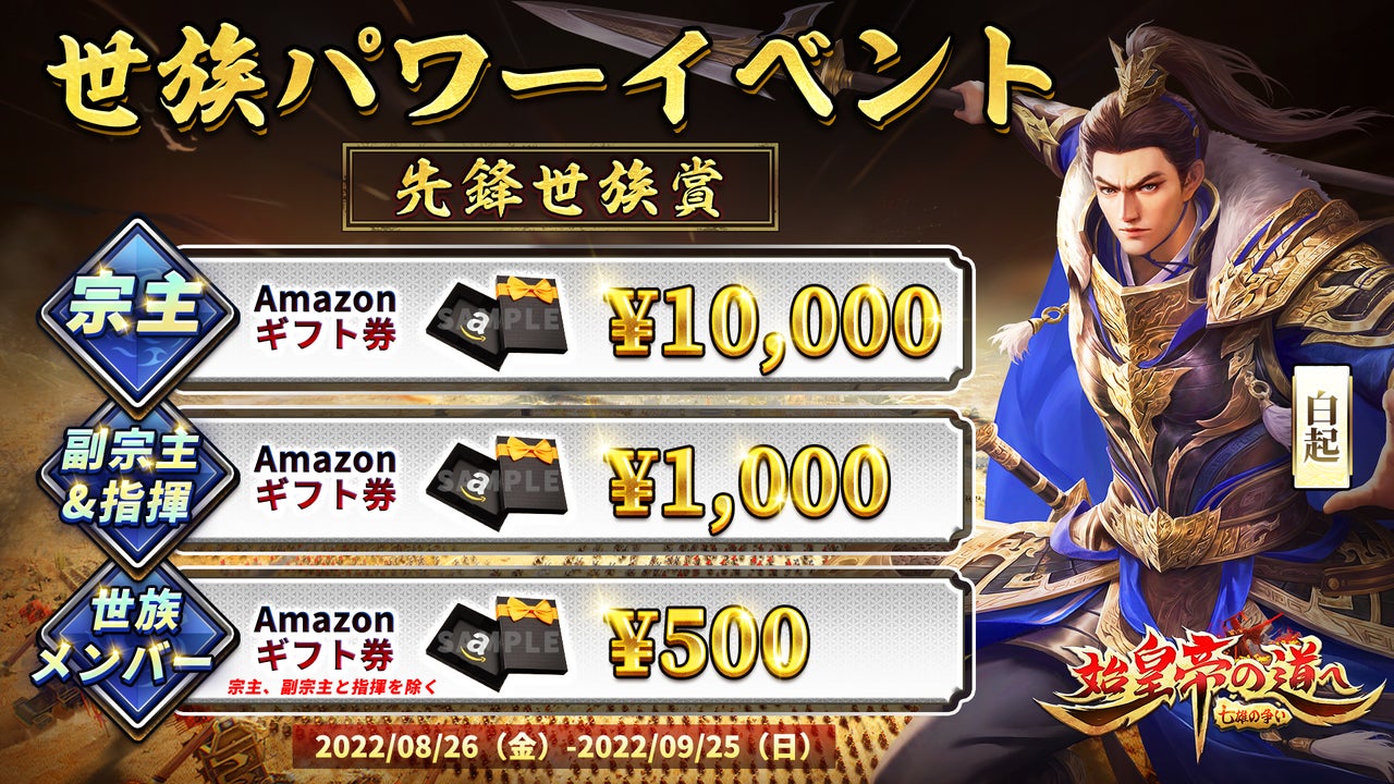 イベント概要:第2回オープンβテスト終了時に、勢力値が最も高いレベルの世族メンバー全員に、メンバーレベルと攻城戦参加回数に応じてAmazonギフト券が割り当てられ、個人には最大1万円分のAmazonギフト券を受け取るチャンスがあります。 指定の攻城戦をクリアされた方には、世族メンバー全員にAmazonギフト券をプレゼントいたします。