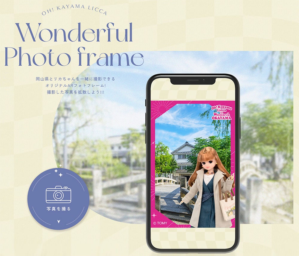 リカちゃんと一緒に写真を撮ることができるARフォトフレーム「Wonderful Photo Frame」を特設サイト内に設置しています。本日2022年10月3日(月)から、リカちゃんが秋冬スタイルにチェンジ。岡山県内の各観光名所を始めとした様々な場所でリカちゃんと写真を撮ってみませんか。