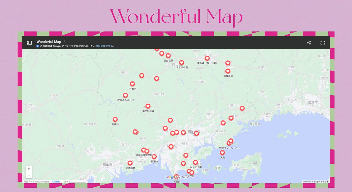 リカちゃんが訪れたり、みんながリカちゃんに教えたい岡山の魅力の一部を地図に落とし込んだ「Wonderful