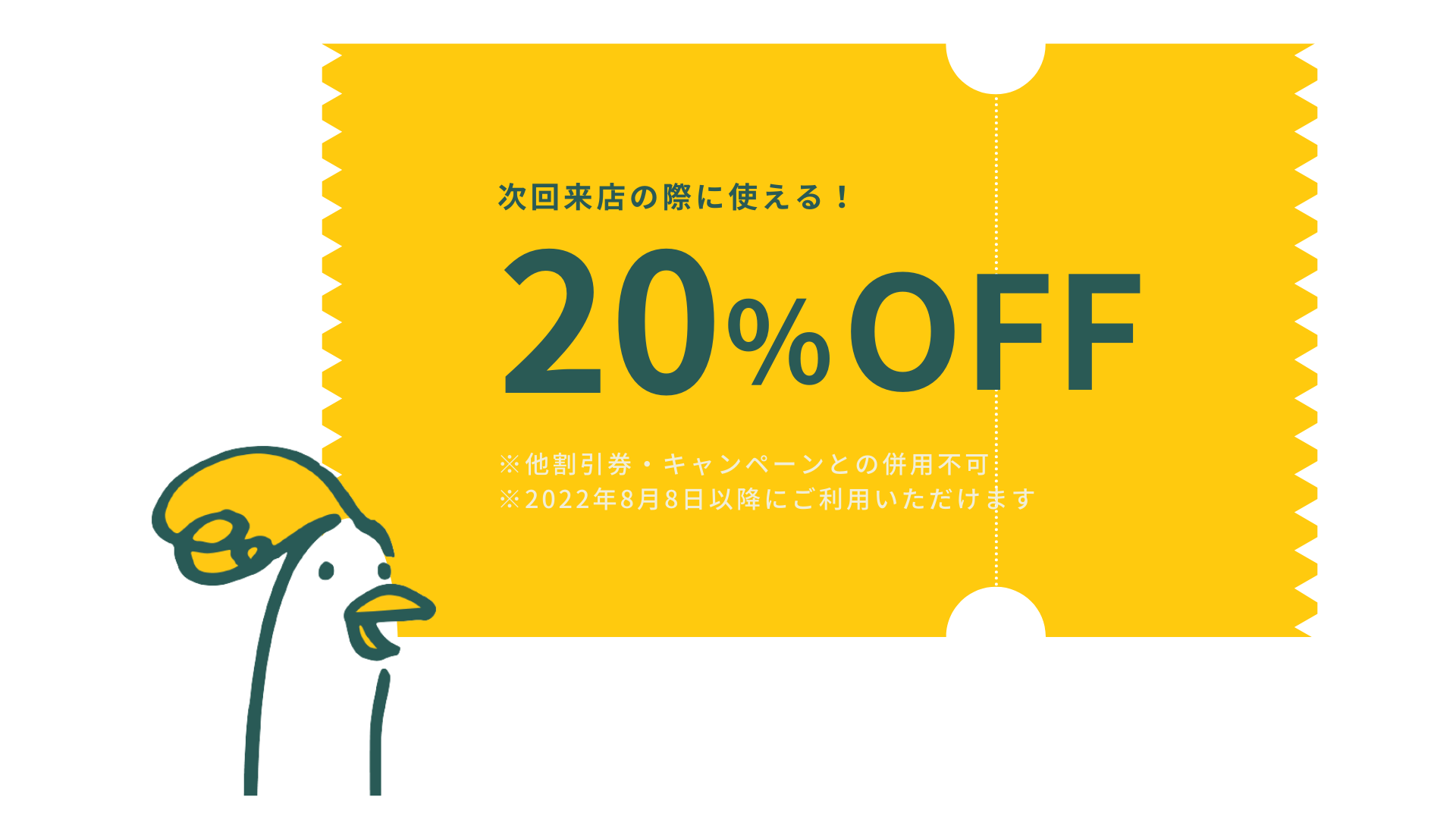 *20%OFFクーポン詳細:他割引やクーポンとの併用不可。ご利用期限は2022年11月30日となります。(店内利用に限る)