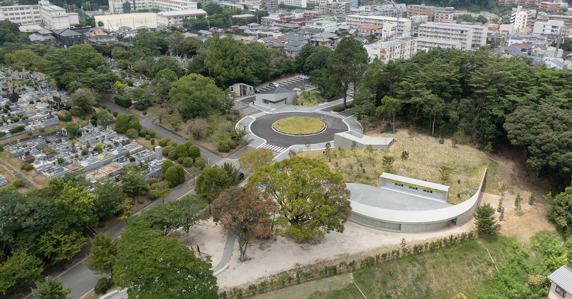 核家族化や死生観の変化で、承継の必要がない墓の需要が高まっています。福岡市は、昭和30年開園の平尾霊園内に新しく合葬式墓所を整備することを決定し、キノアーキテクツがその設計を担当しました。設計にあたって、かつて霊園を造成する際に削られた山に着目しました。今回の建設で生じる掘削土で、その山を修復するよう山裾を延ばし、その下に埋蔵室を埋め、山の上に献花所を設けるというデザインにしたのです。献花所の周りは円弧状の壁とベンチで囲み、その外側に既存樹を活かした公園をつくり、墓所と公園という日常・非日常を壁1枚背中合わせで共存させています。公園や近隣住宅から献花所は直接見えず、山は風景として映ります。故人は山に抱かれて眠り、遺された人は山を前に故人を想い、故人に見守られ公園で過ごします。山の力を借りることで、特定の宗教色のない、自然と調和した施設をつくりました。