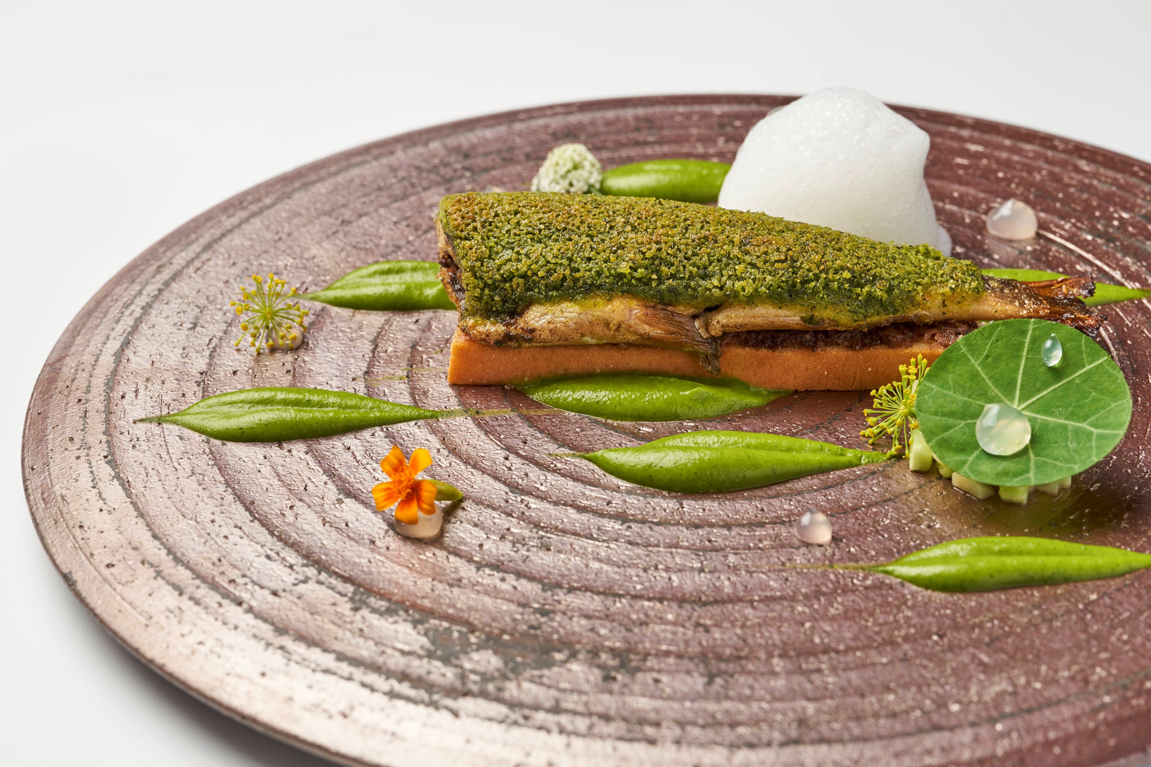 <セルリアンタワー東急ホテル タワーズレストラン「クーカーニョ」:アネットのヴィエノワーズを纏った鮎のコンフィ ぺルノーの香り ※ディナーコース「ムニュー エクサンプロヴァンス」内にて提供>