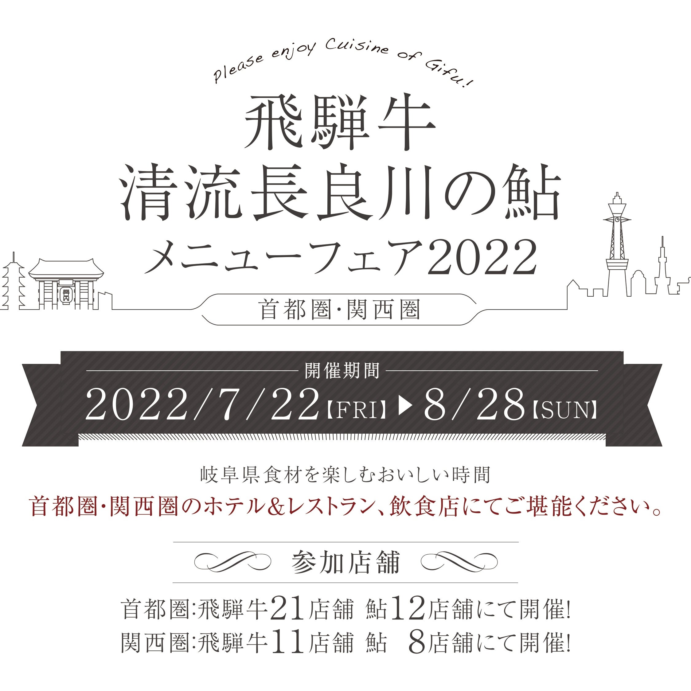 岐阜県では、県産農畜水産物の利用促進とブランド力向上を図るため、大都市圏で各種プロモーションに取り組んでいます。2022年7月22日(金)〜8月28日(日)の期間、首都圏・関西圏のホテル、レストラン、飲食店合計38店舗にて「飛騨牛・清流長良川の鮎 メニューフェア2022 首都圏・関西圏」を開催致します。