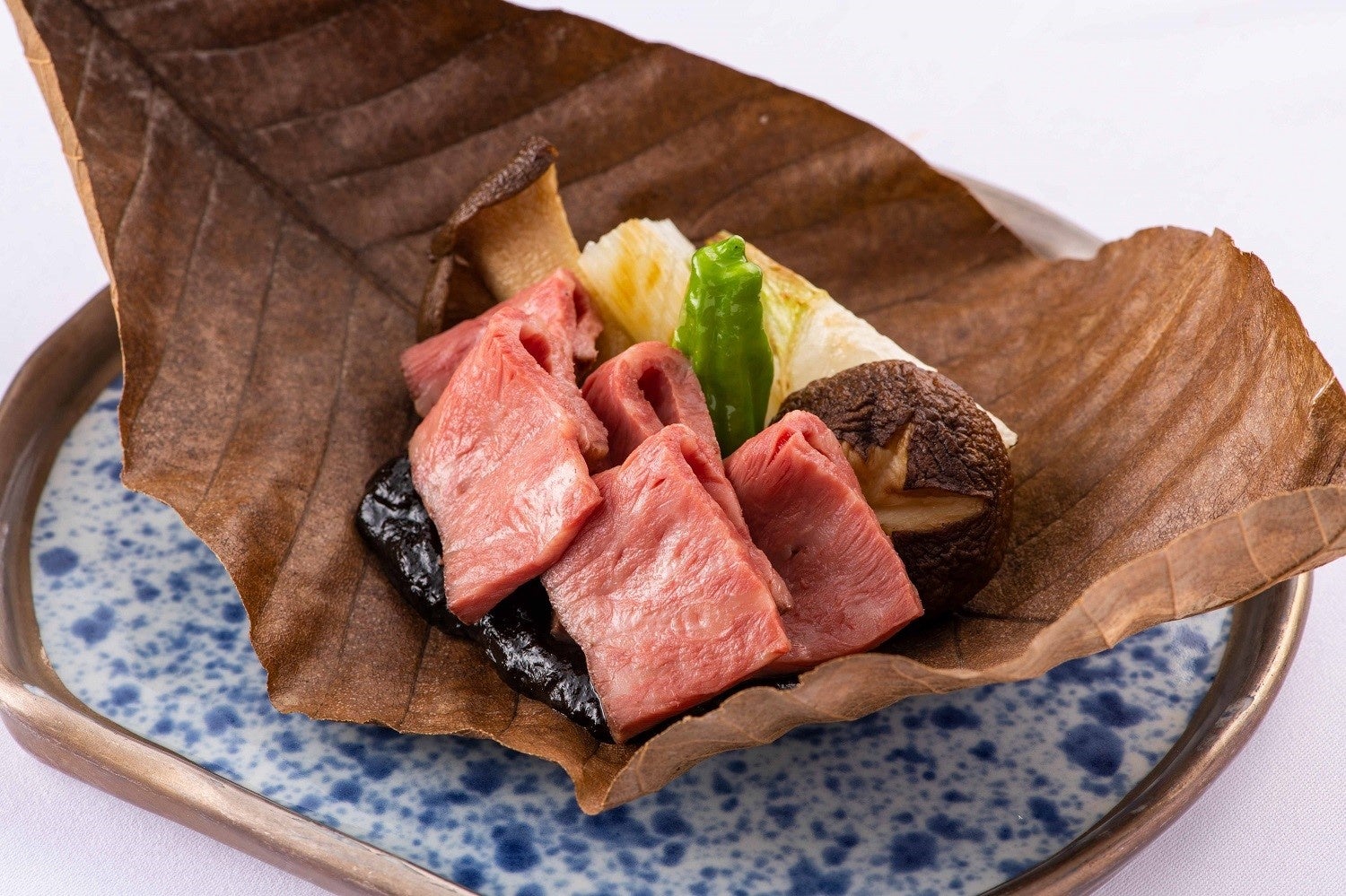 <明治記念館 ビアテラス「鶺鴒」:飛騨牛の朴葉焼き>
