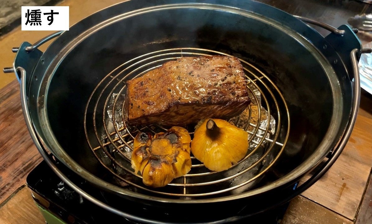 - 1つの鍋が多彩な料理を可能にします。(燻す・蒸す・煮る・揚げる・炒める・茹でる)