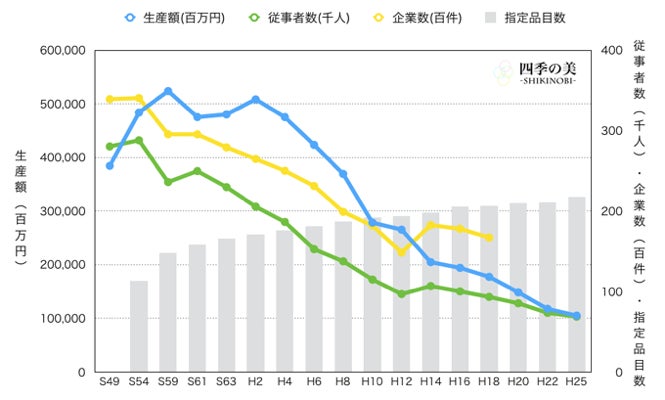 (出典:出典:四季の美 数値出典:(財)伝統的工芸品産業振興協会 ※平成18年度以降の企業数不明)