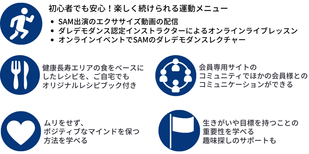 初心者や高齢の方でも楽しめる「ダレデモダンス」を、SAM登壇のイベントやダレデモダンス認定インストラクターによるオンラインレッスンで受講できるほか、隔週で新しい運動メニューの動画が配信されるので飽きずに楽しみながら運動習慣を身につけることができます。