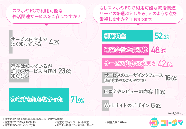 そこで、「スマホやPCで利用可能な終活関連サービスをご存じですか?」と質問したところ、7割以上の方が『存在すら知らなかった(71.9%)』と回答しました。