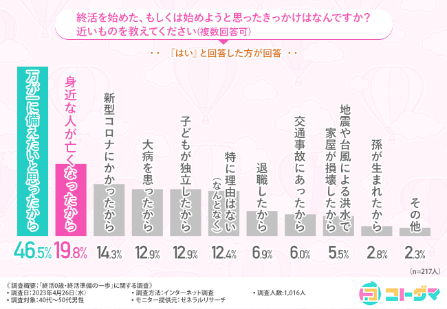 「終活を始めた、もしくは始めようと思ったきっかけはなんですか?近いものを教えてください(複数回答可)」と質問したところ、『万が一に備えたいと思ったから(46.5%)』と回答した方が最も多く、次いで『身近な人が亡くなったから(19.8%)』『新型コロナにかかったから(14.3%)』『大病を患ったから(12.9%)』『子どもが独立したから(12.9%)』と続きました。