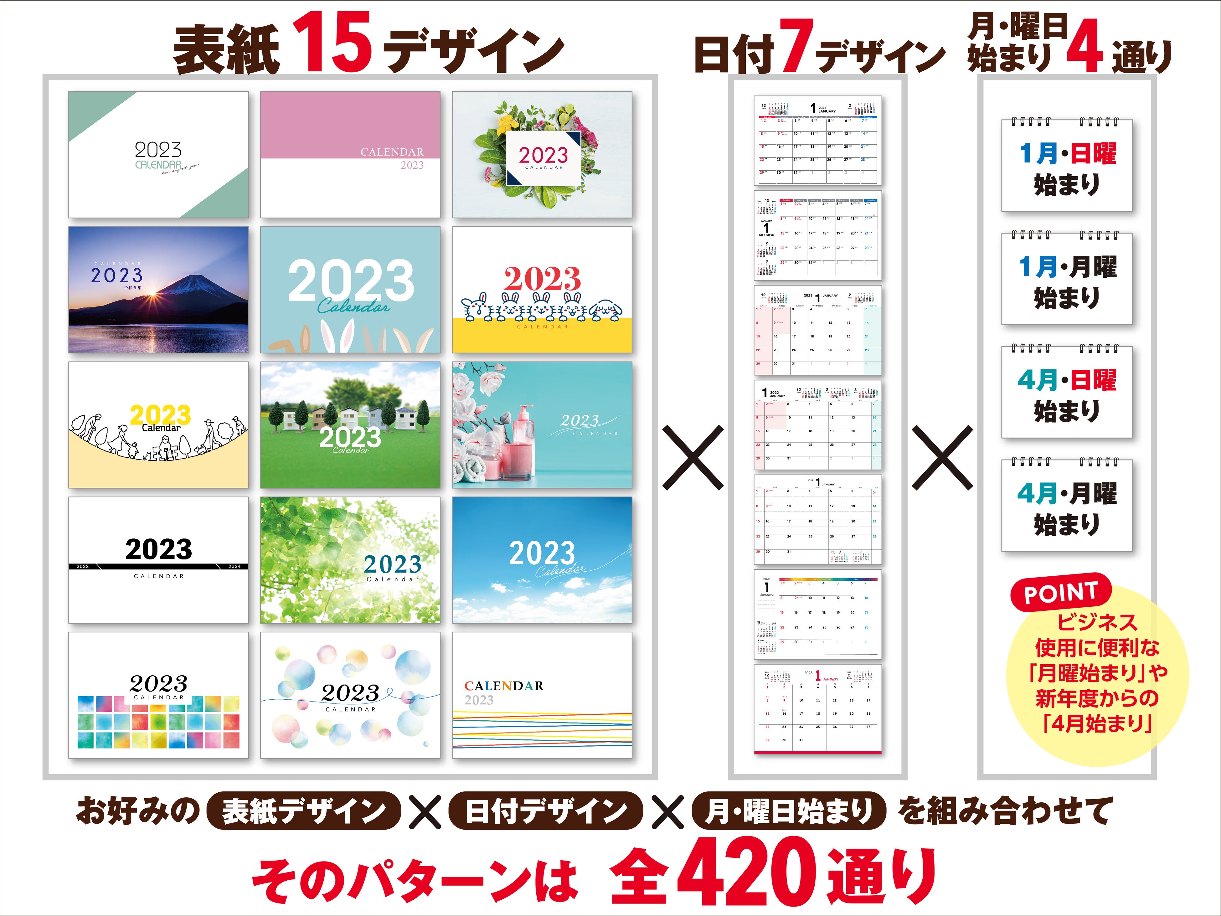 一方、ファインワークスの名入れカレンダーの場合、社内一貫生産により、受注後に名入れだけでなく表紙や日付の印刷・製本も一から行うため、表紙と日付のデザインをそれぞれ選べるようになっています。【表紙デザイン/15種類】×【日付デザイン/7種類】×【スケジュールパターン/4パターン】の合計420通りの組み合わせからお好みのカレンダーを作ることができます。