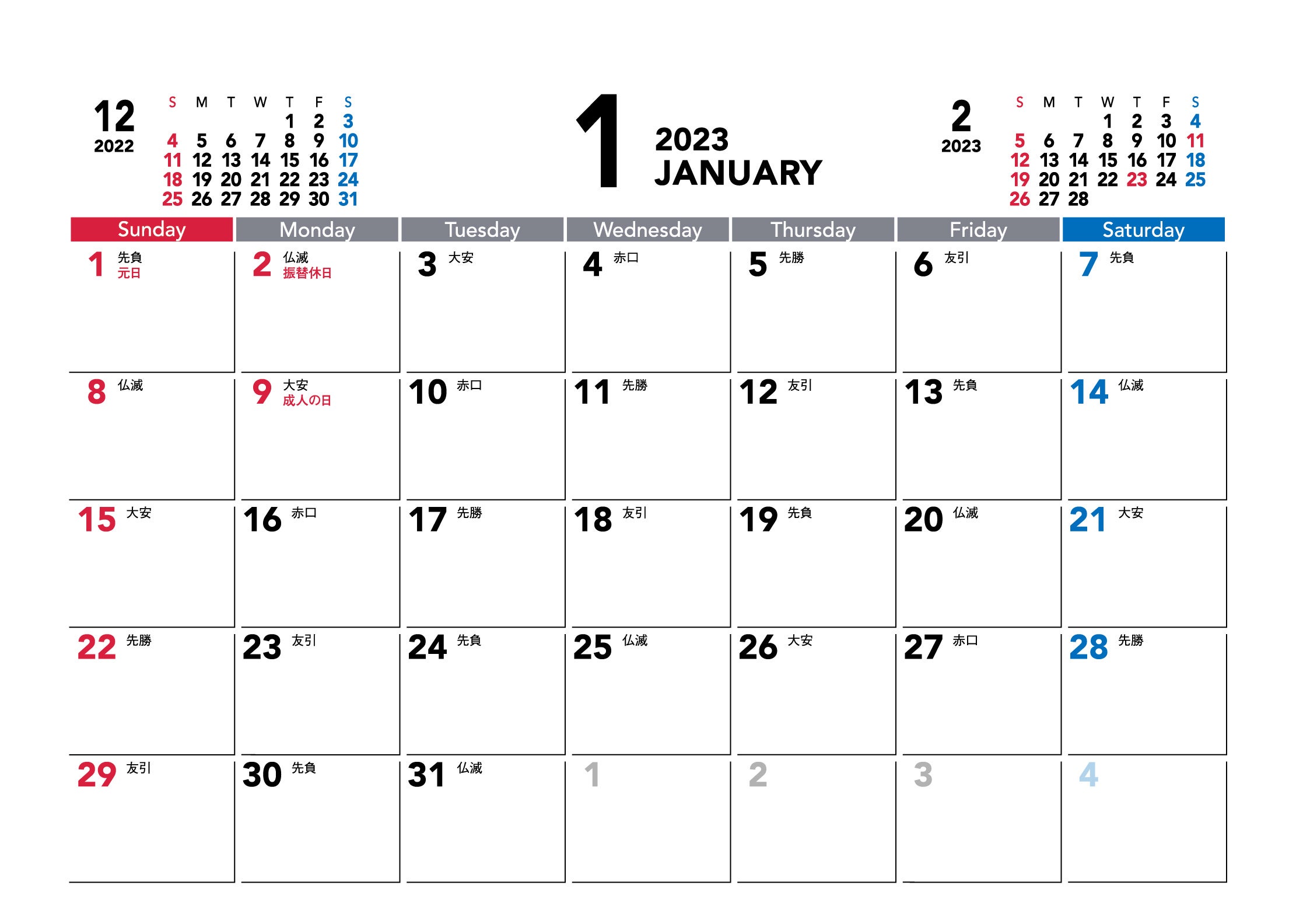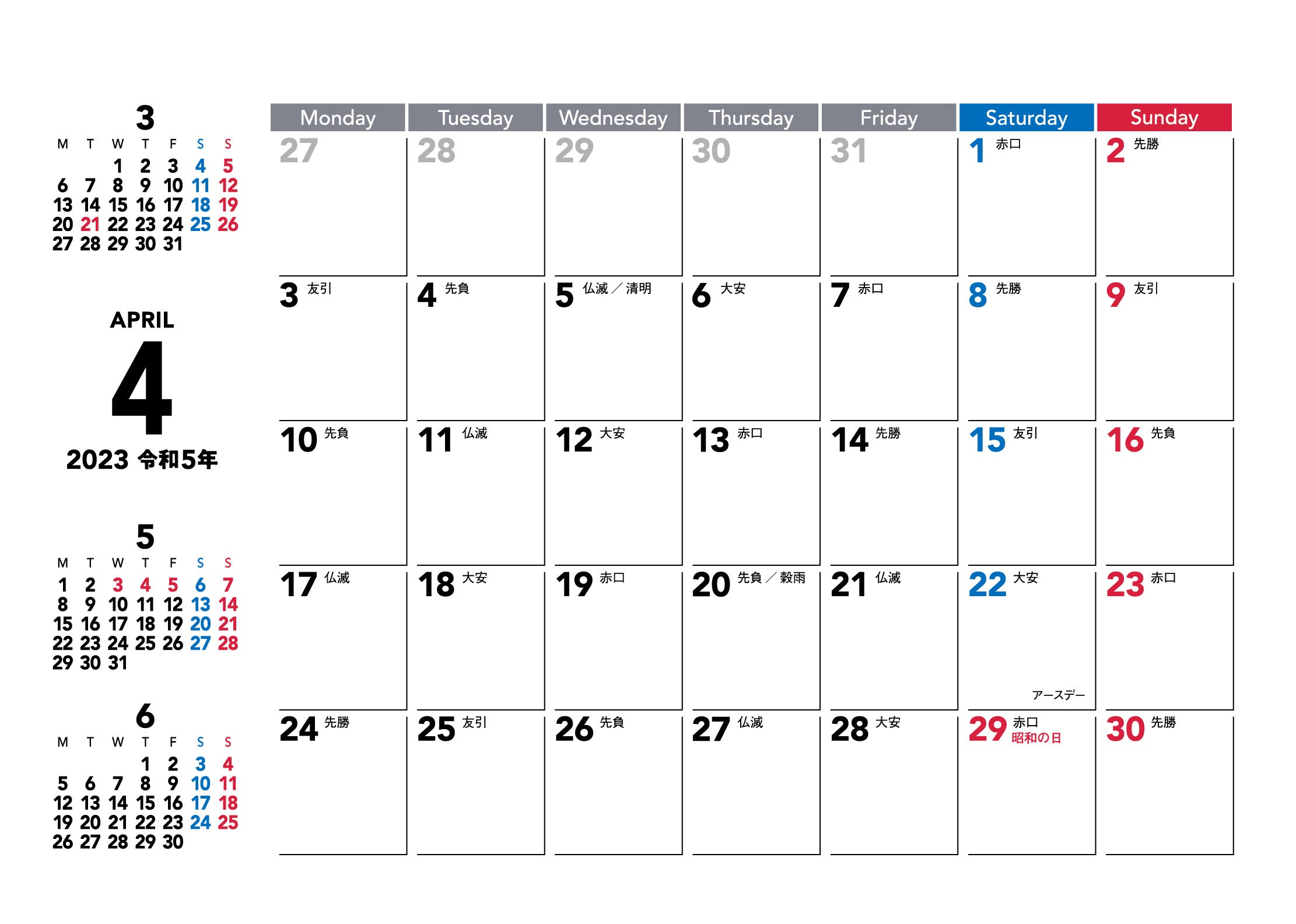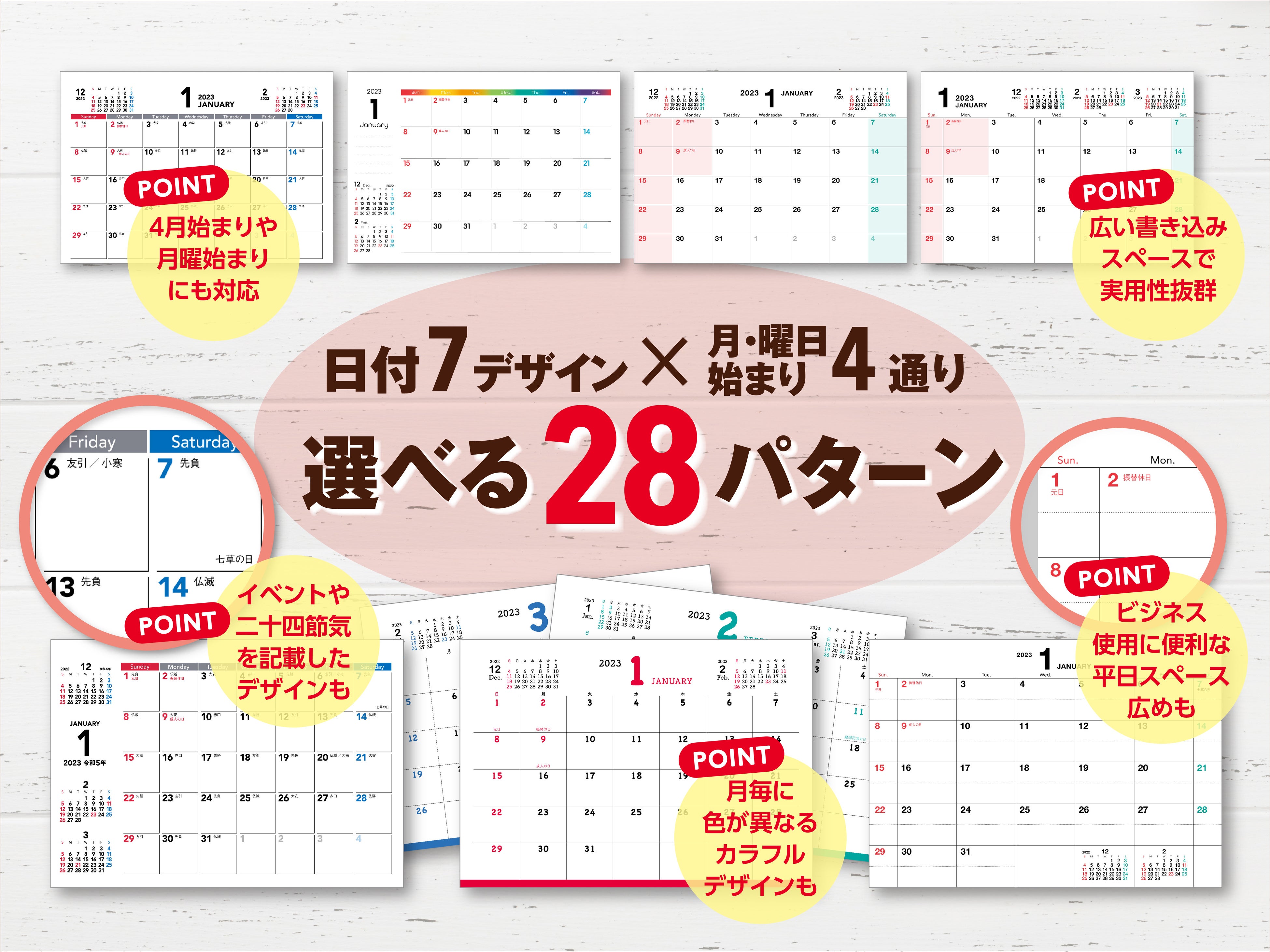 「祝日」だけの必要最小限の情報にとどめたデザインから、「祝日」「六曜」「二十四節気」「イベント」と情報盛りだくさんのデザインまで、ニーズに応じたバリエーションを展開しています。