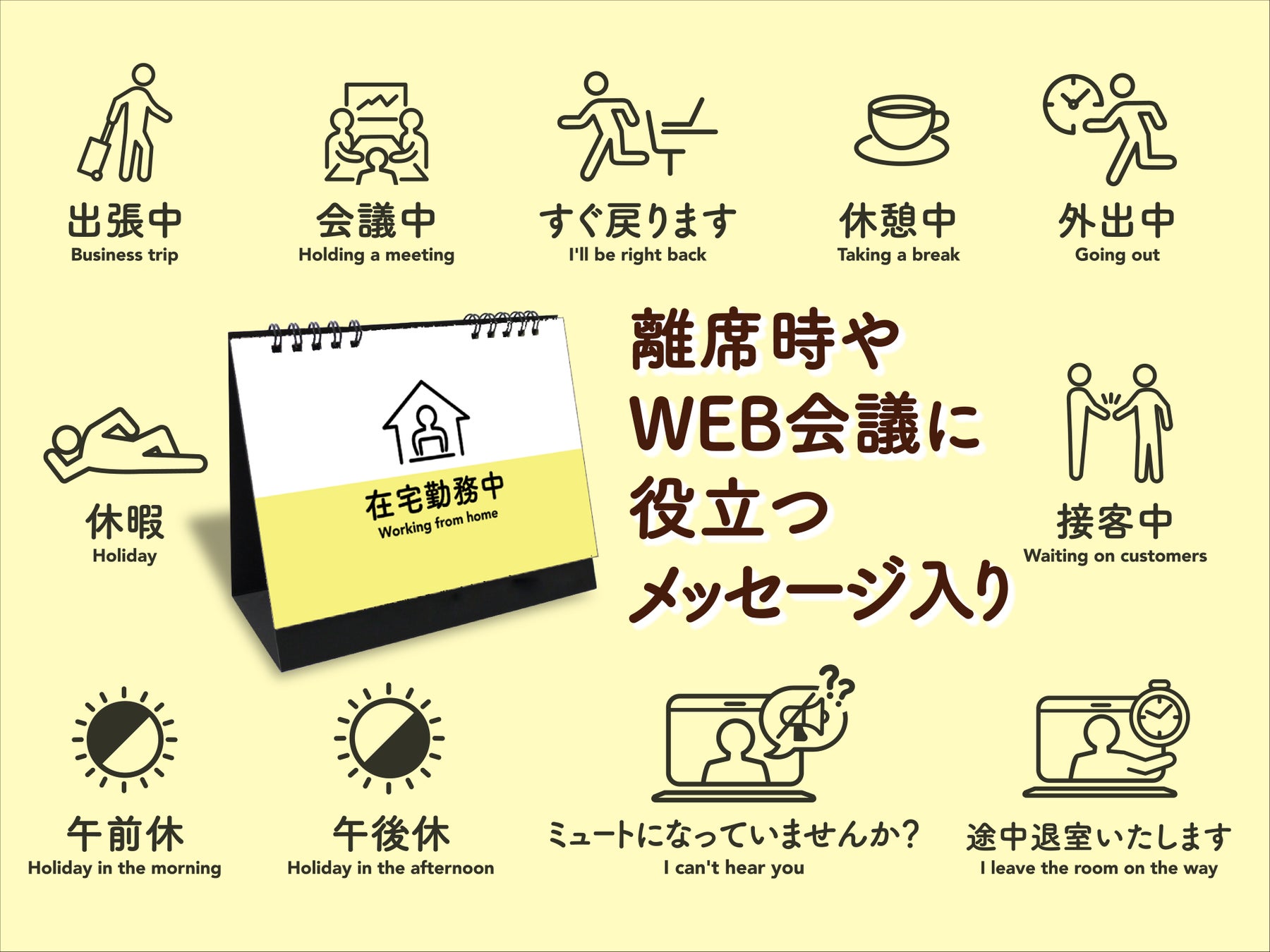 ファインワークスの名入れカレンダーでは、日付デザインのウラ面に『意思表示デザイン』を印刷することが可能です。『意思表示デザイン』とは、ピクトグラムと文字で表現した伝言メッセージであり、『意思表示デザイン』面を見せることで、カレンダー使用者の離席時の状況を社内の人へ伝えることができます。また「ミュートになっていませんか?」などWEB会議で役立つ柄も加わっております。『意思表示デザイン』を選択時には、各月のウラ面に12種類の柄がぞれぞれ印刷されます。