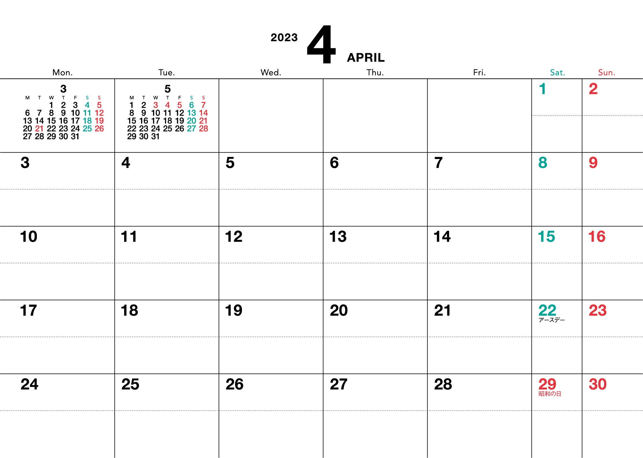 平日に予定をたくさん書き込みたいという方のために、平日の書き込みスペースを広めに取ったデザインもご用意しています。ビジネスシーンで使用したい場合におすすめ。