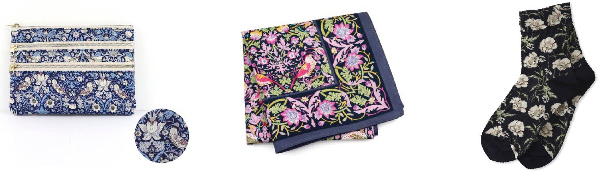 時を経ても世界中から愛されるリバティプリントの人気柄を使用した小物製品を自由が丘店で販売いたします。プレゼントとしても最適のクロスやソックス、ポーチをご用意しました。