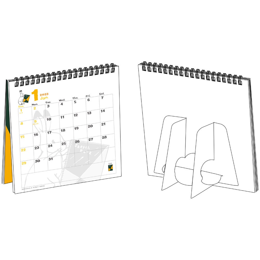 各ページにはそれぞれ動物モチーフのイラストが描かれており、1年を通して異なる表情をお楽しみいただけます。スタンドが付いているので、卓上カレンダーとしても使用できます。カレンダーの後半は無地のページがあり、やりたいことや目標、思い出など好きなように描くこともできます。
