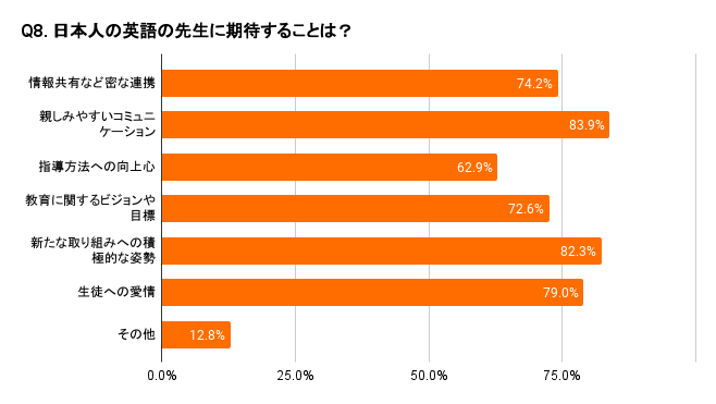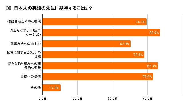 ・日本人の英語の講師、先生に期待することは、約8割が回答したトップに「親しみやすいコミュニケーション」、次いで「新たな取り組みへの積極的な姿勢」「生徒への愛情」がランクイン。フリーコメントでは「外国人のアイデアを受け入れることができ、固定観念にとらわれない」といった異文化理解の姿勢や、「学習は楽しいものであるべきで、英語は試験を受けるためだけに使うものではないという認識」といった語学を学ぶ目的の捉え直しなどの意見も見られました。