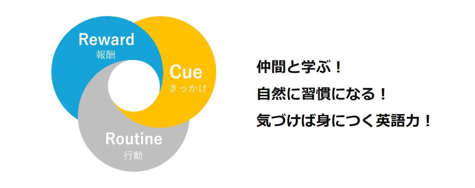 この「継続できない」問題を解決できるよう、エー・トゥー・ゼットでは手軽な習慣で楽に英語が身につく「Habit Making(ハビットメイキング)」という英会話プログラムを提供しています。このプログラムは、ハーバード大で科学的に実証された習慣化の法則でCue(きっかけ)・Rutine(行動)・Reward(報酬)のサイクルを活用し、効果的に英語学習を習慣化していくメソッドを取り入れています。