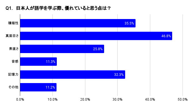 ・日本人が語学を学ぶ上で優れている点は、約半数が「真面目さ」と回答しトップ