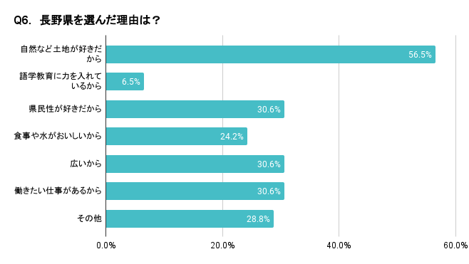 ・エー・トゥー・ゼット本社がある長野県に居住している語学講師が長野県を選んだ理由は、「自然など土地が好きだから」が約6割でトップとなりました。フリーコメントでも「八ヶ岳」など山岳を理由にしていたり、「松本が大好き」といった長野県の自然に惹かれて選んでいる人が多いことがわかります。