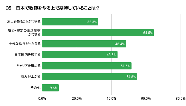 ・日本で教師をやる上で期待していることは、「安心・安定の生活基盤ができる」が約65%でトップ。次いで「能力が上がる」「キャリアを積める」「十分な給与がもらえる」と続きました。日本で外国語学講師として暮らし、安心できる生活を構築したいという、長期的な就業意欲がうかがえます。