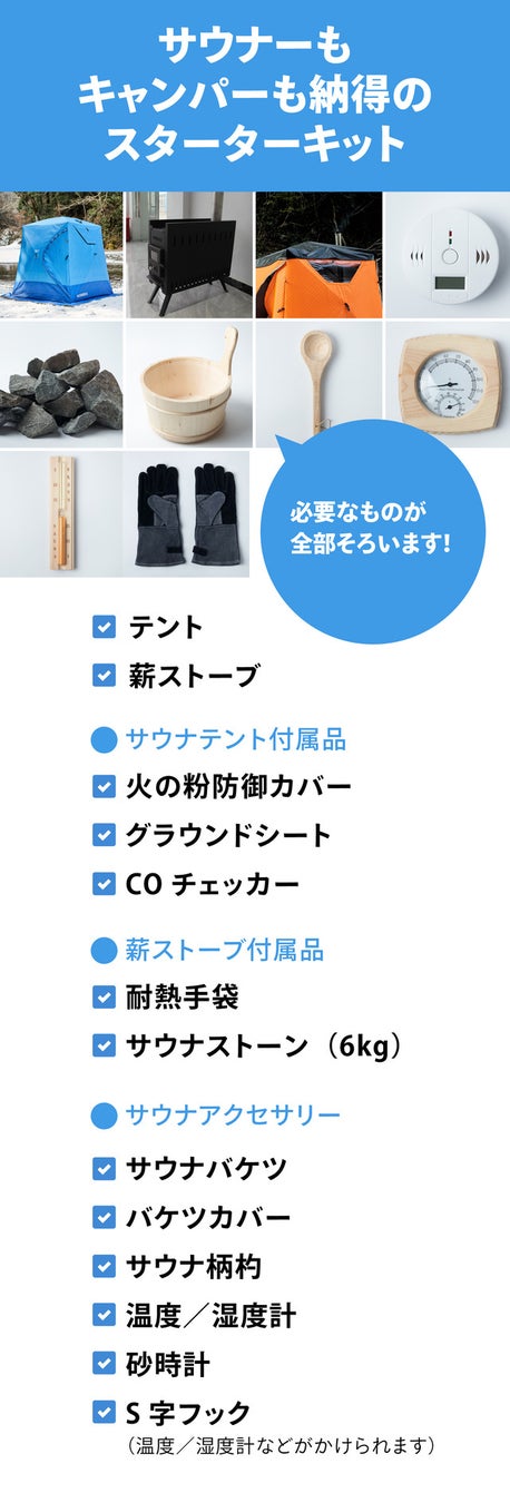 サウナテントには火の粉防御シート、グラウンドシート、CO チェッカー、薪ストーブには耐熱グローブ、サウナストーンが付いており、別売になりますが、サウナアクセサリー(サウナバケツ、バケツカバー、サウナ柄杓、温湿度計、砂時計)もご用意しております。