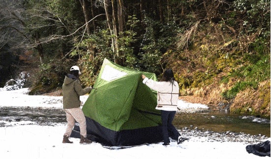 テントは紐を引っ張る だけの簡単設置、慣れれば2,3分で居心地のいいテント空間ができます。