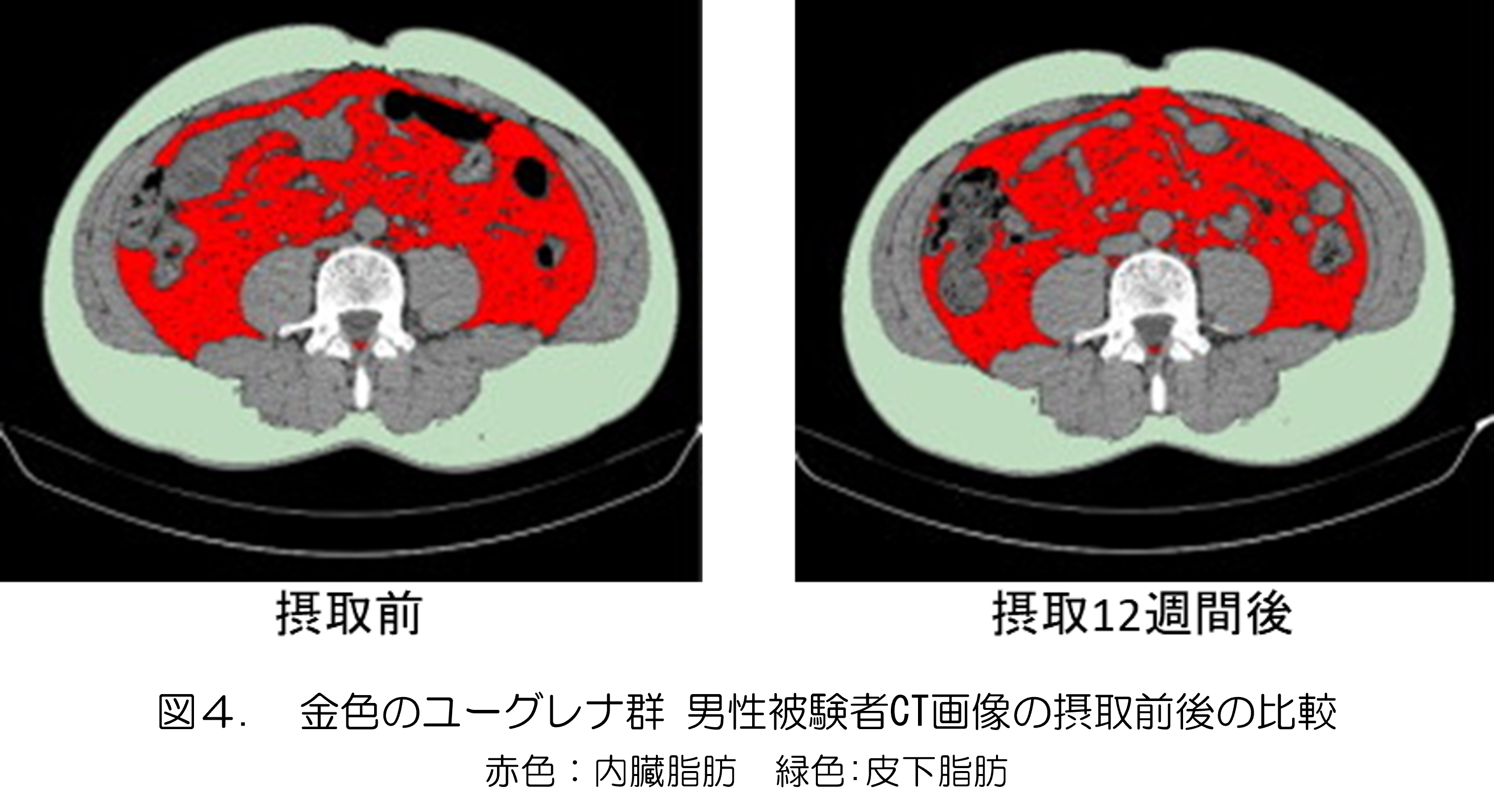 - 男性の比較においては、金色のユーグレナ群は対照群と比較して、内臓脂肪面積の有意な低下が確認された(図3、4)。