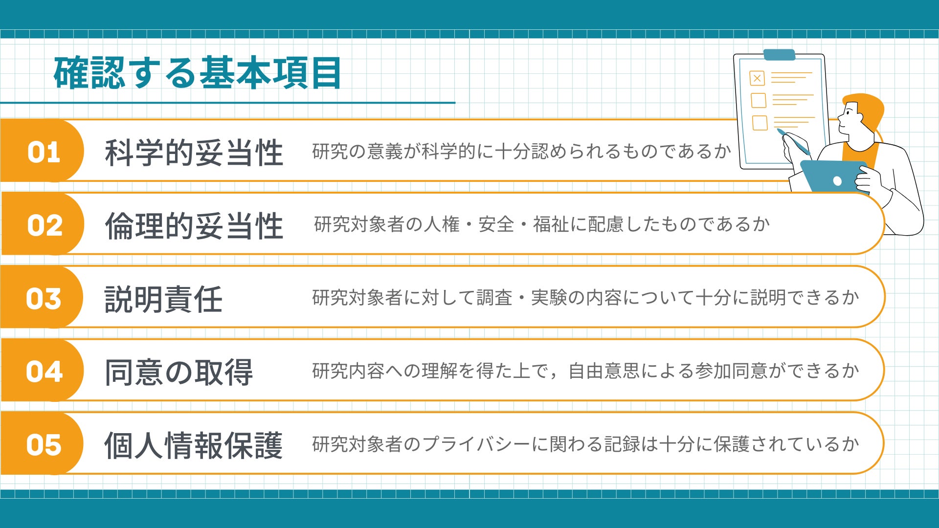 人間を対象にデータを取るときには、参加者が自分の意思で参加を決めたりやめたりできるのか、心身への影響はないか、個人情報が適切に扱われているかなどを確認します。