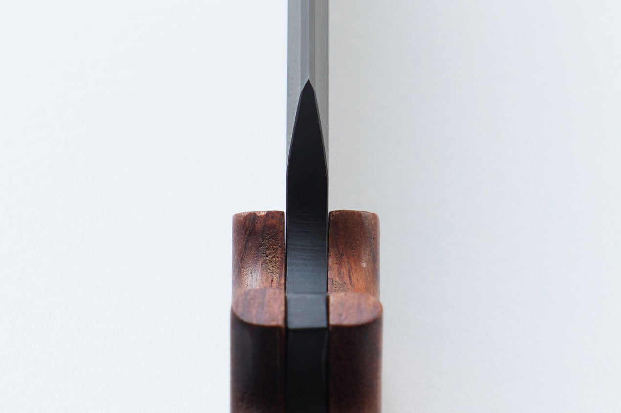素材に採用した炭素鋼のSK85は、包丁やナイフで使われている一般的なステンレスより硬く切れ味が良い一方で、素地のままだとやや錆びやすい傾向にあります。そこで、サンドブラストと四三酸化鉄処理を組み合わせ、メッキや塗装を上回る強度の、マットな黒色被膜を形成しました。