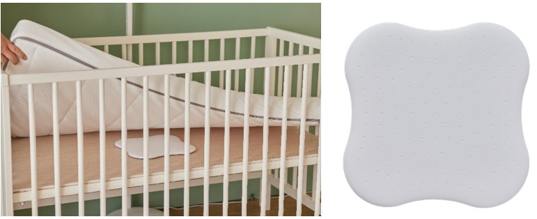 設置はマットレスの下に敷くだけ。赤ちゃん自身に触れないので身体への負担がありません。(CuboAi ベビーセンサーパッドは電池式(単4アルカリ乾電池 4本使用)です)