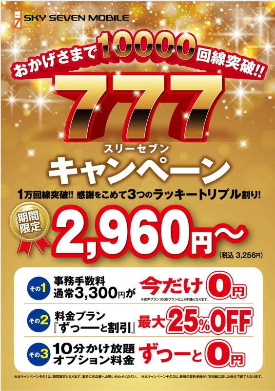 ワケありの方でも契約可能な携帯電話!審査なし・本人名義で契約できる スカイセブンモバイル 稲毛店 10GBプラン以上ご契約で手数料無料 スリーセブンキャンペーン!