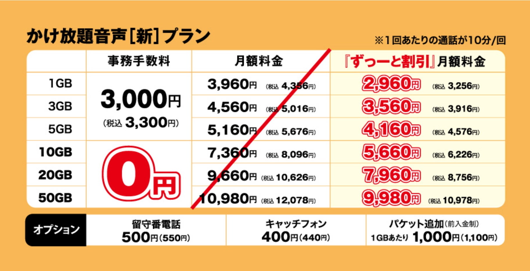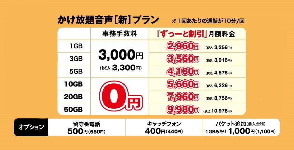 パケット1GB + 何度でもかけ放題(連続10分間) で月額2,960円(税抜)~