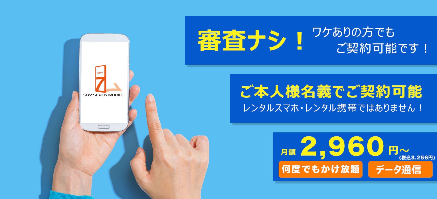 スカイセブンモバイルは、審査なし(※)でご本人様名義のスマートフォンSIMが契約できる総務大臣認定の携帯電話会社です。 様々な事情で他社の携帯会社で契約ができない方でも、身分証と銀行口座があればその場でご契約いただけます。 レンタル契約ではないので、他社で高額なレンタルスマホ携帯をご利用の方にも大変おすすめです。