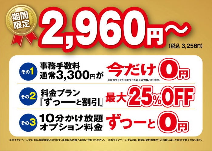 よりご契約しやすい『ずーっと割引』開始!パケット1GB 10分間かけ放題つきで月額2,960円(税抜)~