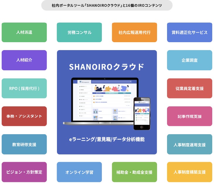 ■ SHANOIROは、社内ポータルツールと16個のIROコンテンツを提供する人事労務の総合的なサービスです。