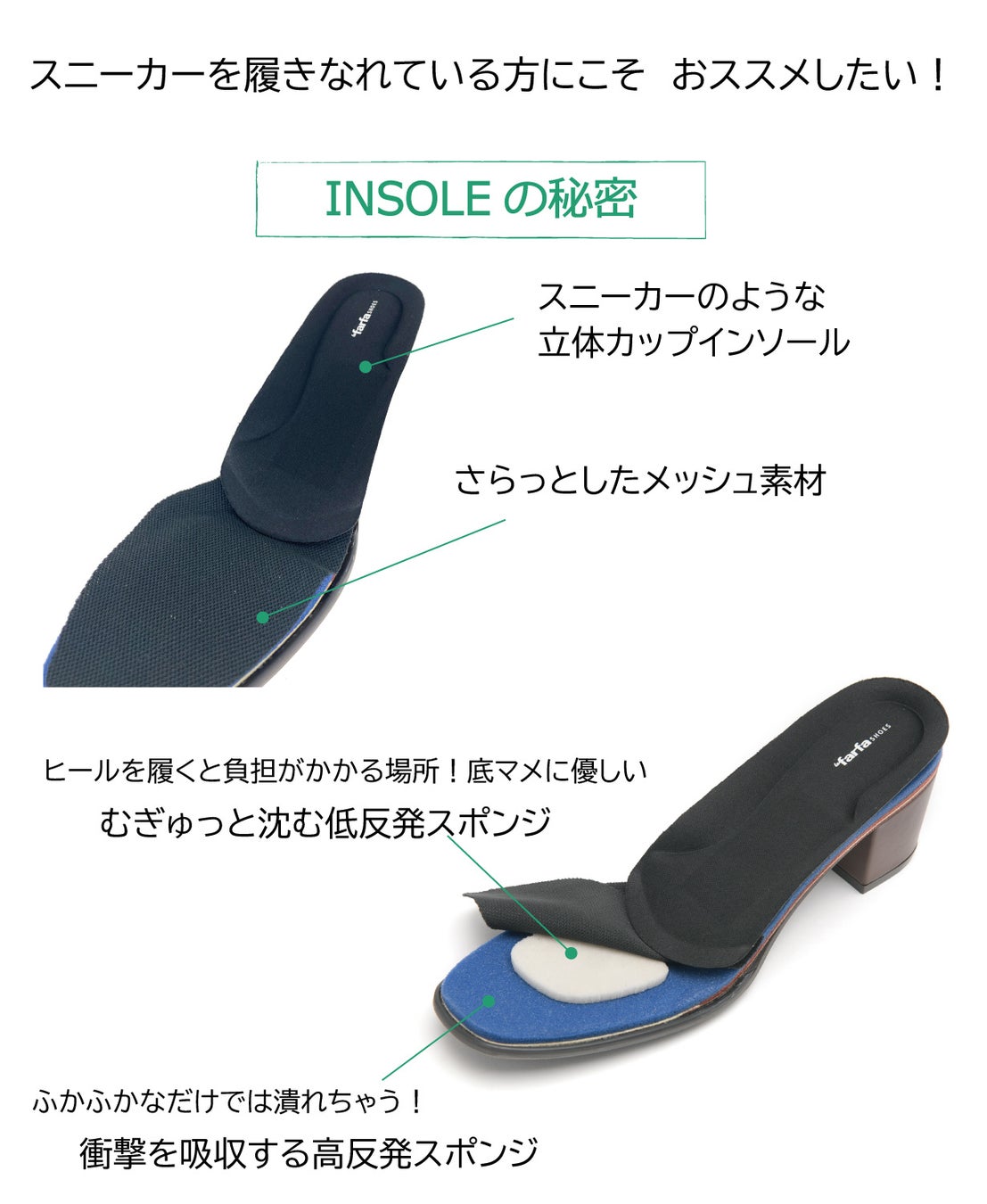 ヒールがあっても、ブーツであっても、スニーカーと遜色ない履き心地を追求し、低反発スポンジと高反発スポンジ、さらに足裏のカーブに合わせたふかふかのモールドスポンジを駆使した高機能インソールを使用。
