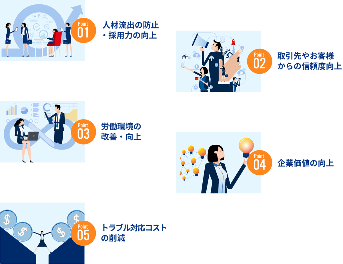 ハラスメント対策を適切に講じることでトラブルを未然に予防し職場環境を改善することは、従業員の士気を高めるだけでなく企業とステークホルダーとの信頼関係の構築に繋がり、社会的信用や企業価値を向上させます。