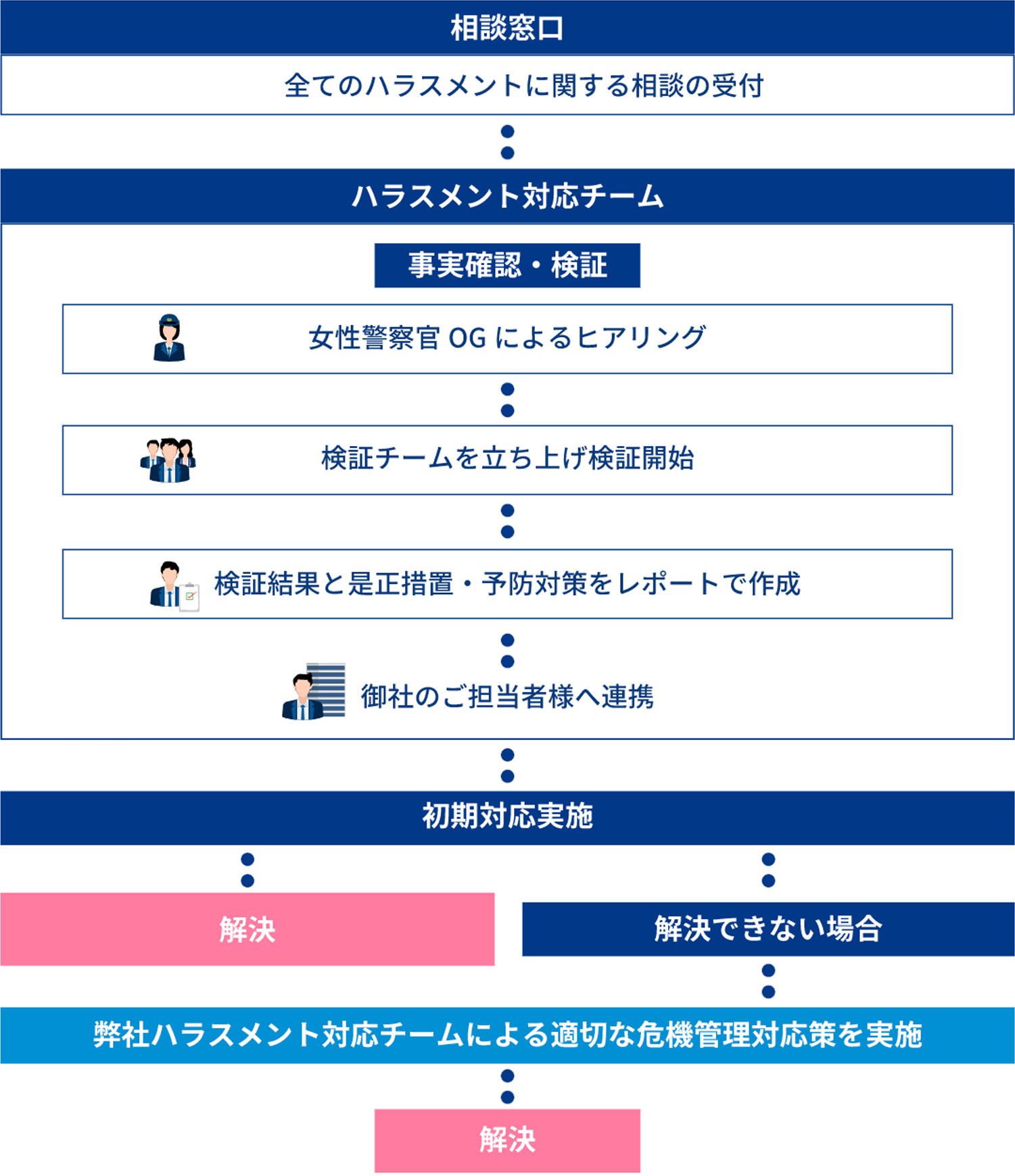 JSTのハラスメント外部相談窓口では、ハラスメント対応や法令を熟知した経験豊富な女性警察官OGが選任で対応することで、このような問題を円滑に解決します。